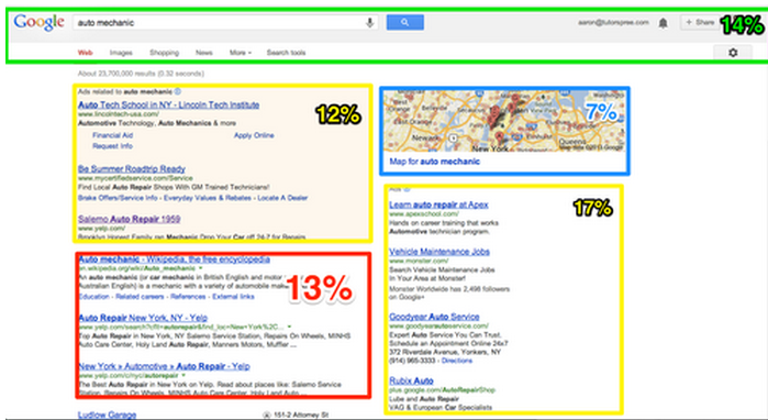 Lang ist es her, dass auf den Google Suchergebnisseiten 10 Links zu Webseiten aufgelistet wurden, deren Inhalte zur Suchanfrage der Nutzer passten. Inzwischen dominiert Google eigener Content und Anzeigen die SERPS, sodass die organischen Suchergebnisse immer weiter nach unten rutschen und nur noch wenige auf der Seite aufgelistet werden. Insgesamt nehmen die Anzeigen 29 % des Bildschirms ein. 12 % davon befinden sich oben und 17 % an der Seite. Die Google Karte mit lokalen Ergebnissen nimmt 7 % des Platzes ein. Für die eigentlichen Suchergebnisse bleiben nur 13% der Bildschirmgröße. Fast soviel wie für die Google Navigation, die 14% des Platzes für sich beansprucht.